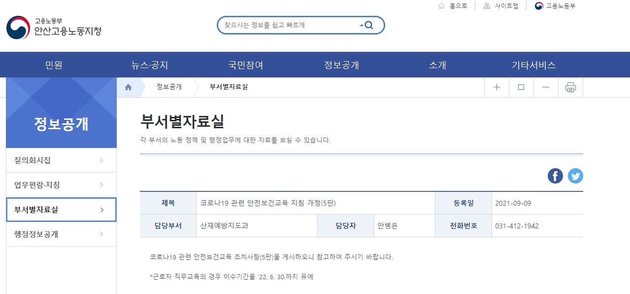 산재예방지도과, 코로나19 관련 안전보건교육 지침 개정(5판)