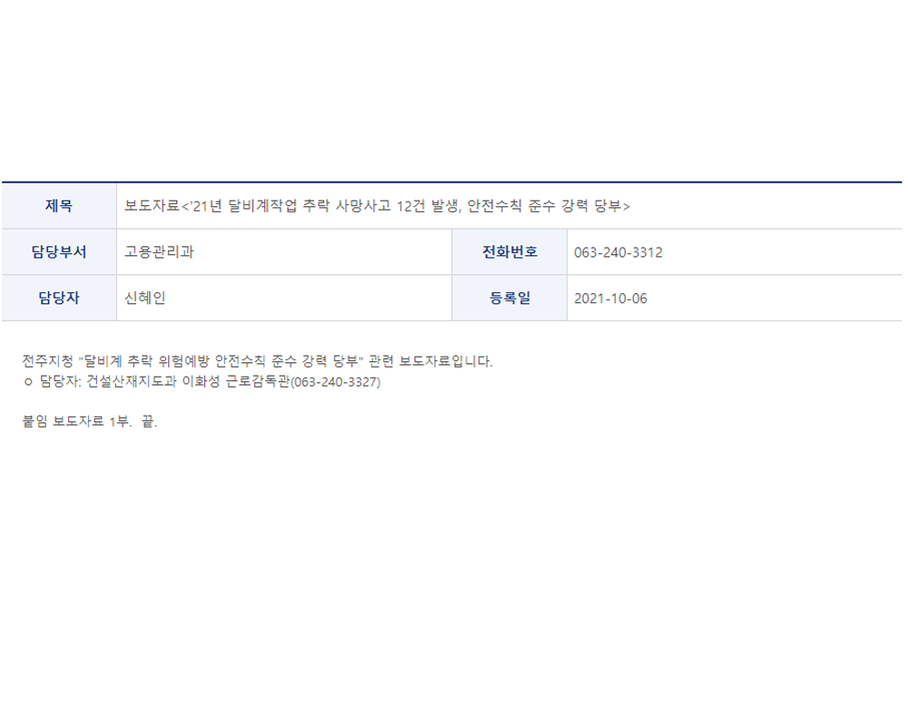 고용관리과,보도자료<'21년 달비계작업 추락 사망사고 12건 발생, 안전수칙 준수 강력 당부>